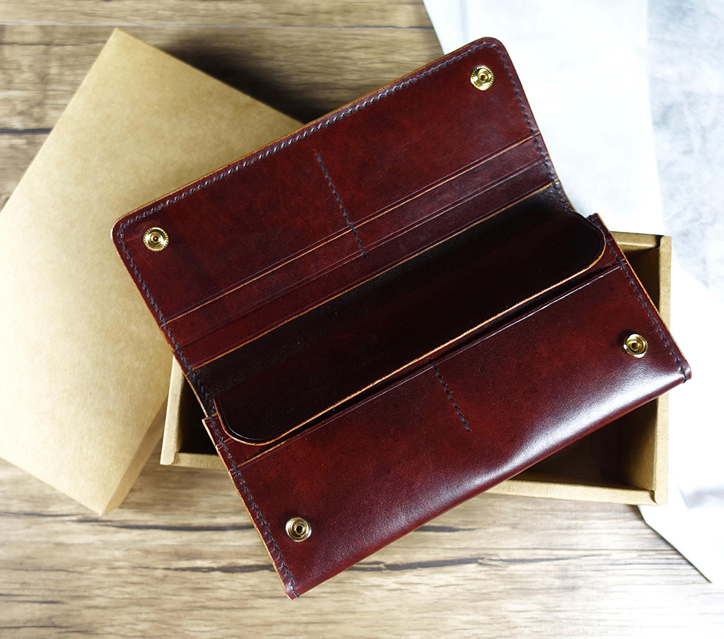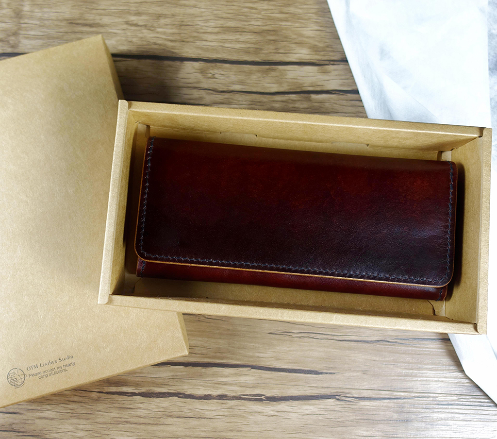 完成後,將得到一只結構清楚、比例穩定、可實際長期使用的單層風琴長夾。整體以植鞣革製作,皮革會隨著使用時間逐漸產生自然的色澤變化,每一只作品都會留下屬於使用者的痕跡。– 左圖:直線型卡片結構 – 右圖:曲線型卡片結構